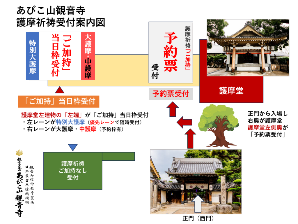 正門入場後、右奥が「護摩堂」です。予約票受付は「護摩堂左側奥」です。