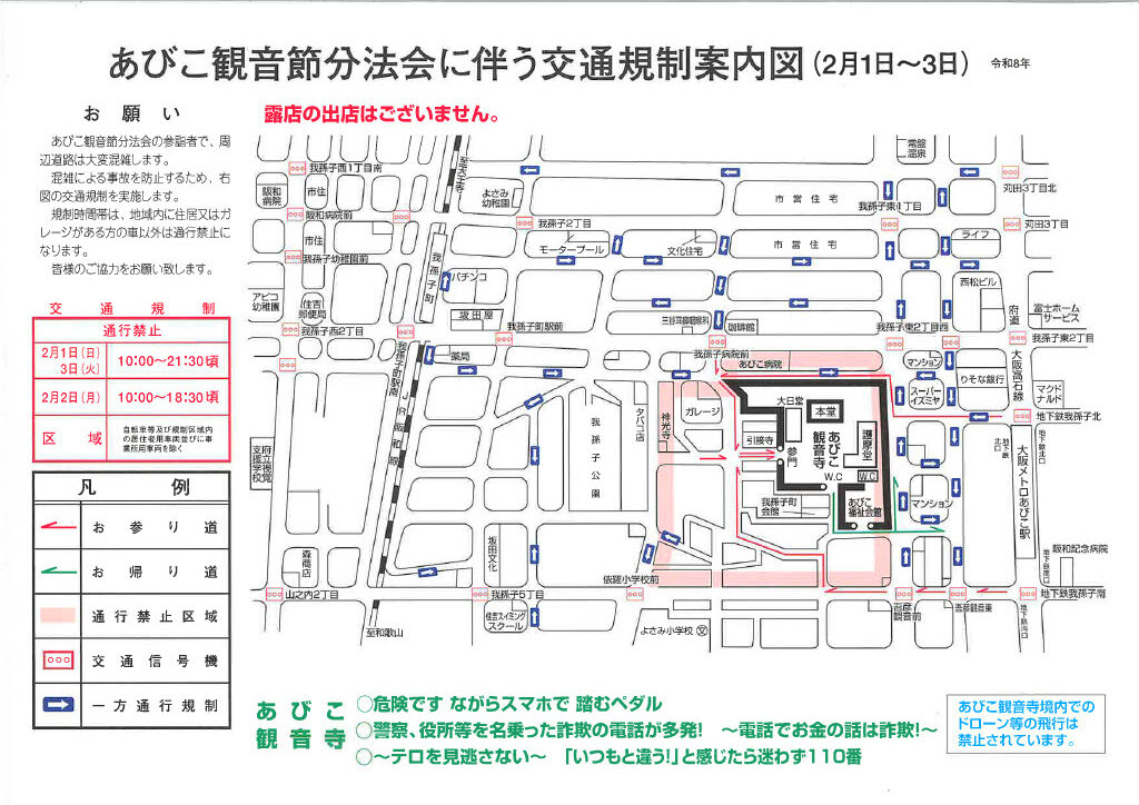 2月1日、2日、3日の「10時から21時30分頃まで(2日は18時30分頃まで)」は、お寺周辺で交通規制があり、お寺の駐車場は閉鎖しますので、ご注意ください。詳しくは、次の案内図を参照ください。